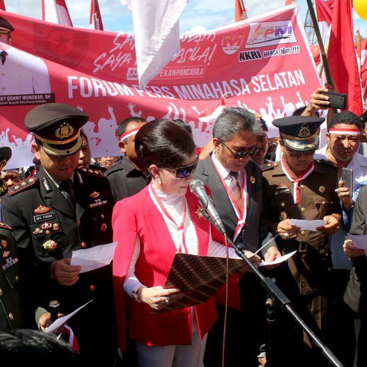 "Atas tuntutan Tuhan Yang Maha Kuasa, kami pemerintah dan masyarakat Minahasa Selatan menyatakan kebulatan tekad sebagai berikut; Siap menjaga dan mempertahankan Pancasila sebagai satu-satunya ideologi bangsa Indonesia," seru Tetty.