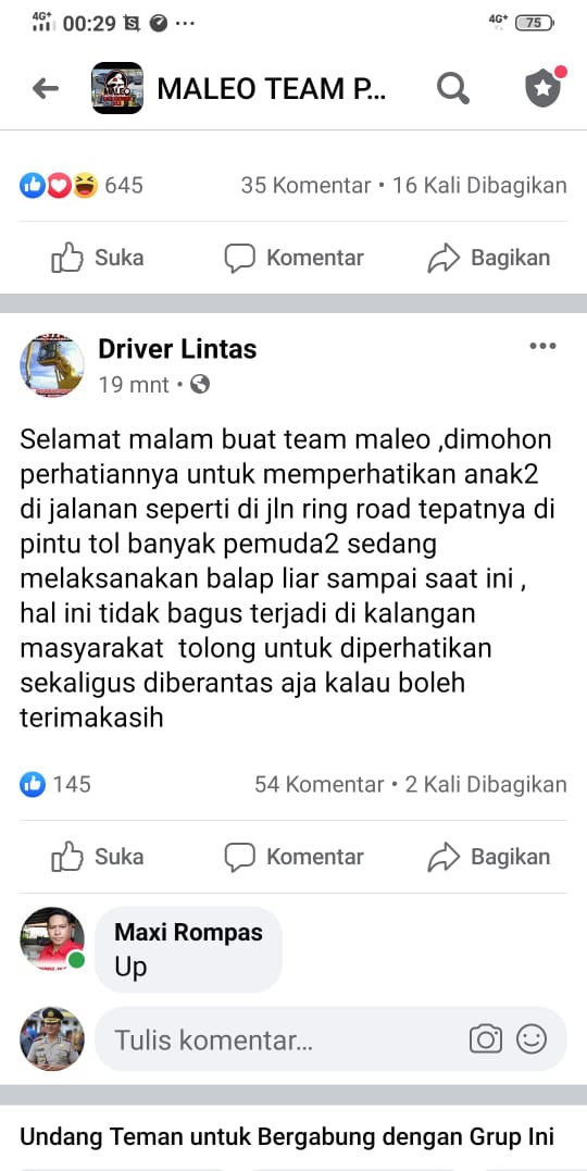 “Berdasarkan permintaan masyarakat yang dimuat di akun facebook Driver Lintas, Tim Maleo merespon dan melakukan patroli di ringroad, depan pintu tol. Kami temukan kumpulan anak-anak muda yang berkumpul dengan sepeda motor masing-masing. Selanjutnya dilakukan pembinaan agar tidak melakukan balap liar,” kata Katimsus Maleo Kompol Prevly Tampanguma.