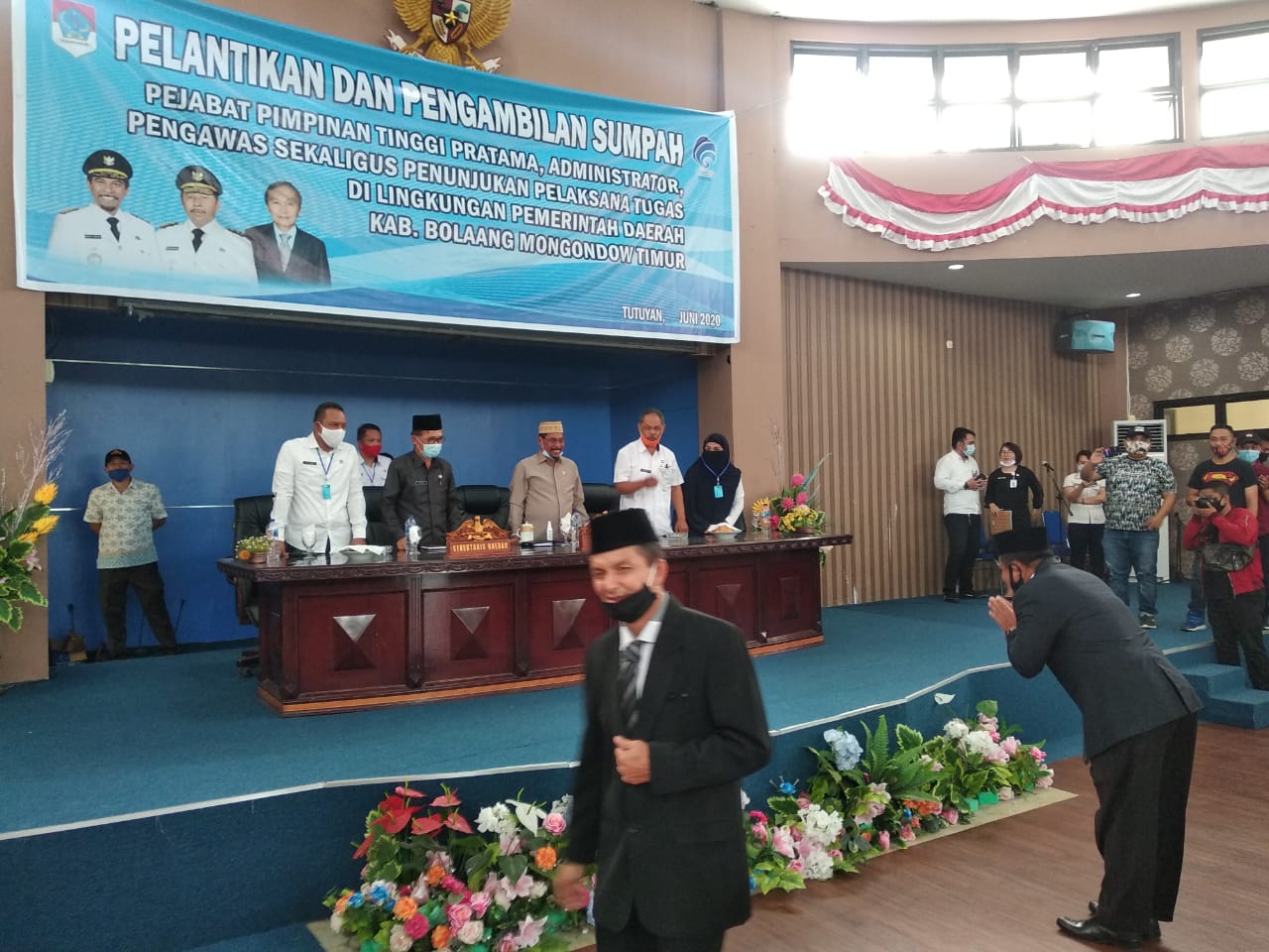 Bupati Kabupaten Bolaang Mongondow Timur (Boltim), Sehan Landjar, melantik dan mengambil sumpah kepada pejabat pimpinan tinggi pratama, administrator, pengawas serta penunjukan pelaksana tugas (Plt) di lingkungan Pemerintah Kabupaten Boltim.