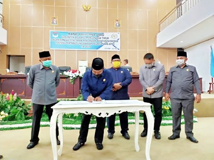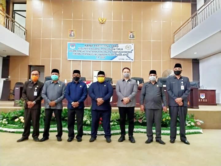 Dewan Perwakilan Rakyat Daerah (DPRD) Kabupaten Bolaang Mongondow Timur (Boltim), melakukan rapat paripurna dalam rangka penetapan Rancangan Peraturan Daerah (Ranperda) tentang pertanggungjawaban pelaksanaan Anggaran Pendapatan Belanja Daerah (APBD) tahun anggaran 2019.