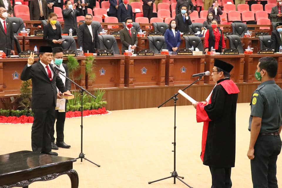 Pengucapan sumpah dipandu Ketua Pengadilan Tinggi Manado Arif Supratman, dalam rapat paripurna DPRD Provinsi Sulut yang dipimpin Wakil Ketua DPRD Sulut Victor Mailangkay, Senin (26/10), di ruang rapat paripurna DPRD Provinsi Sulut.