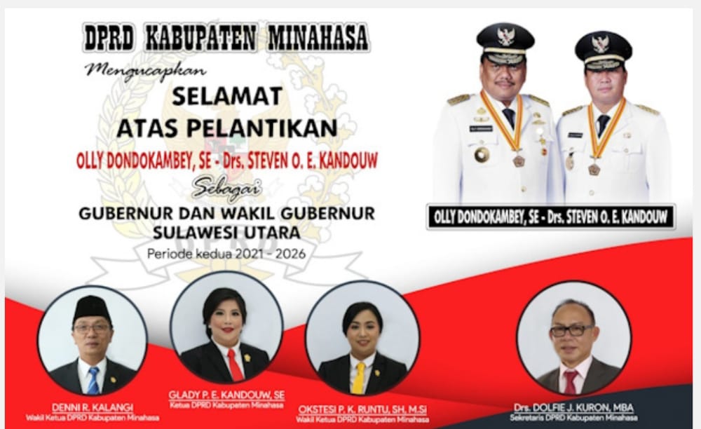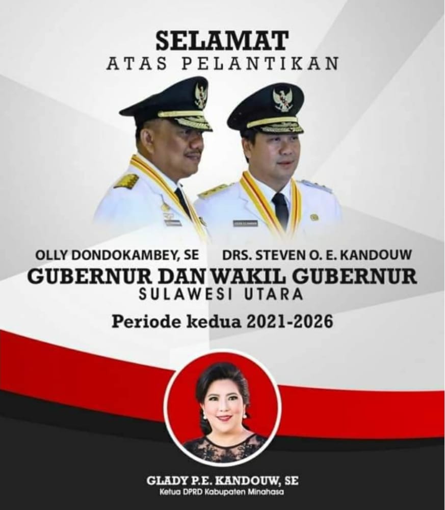 “Atas nama pribadi, keluarga, pimpinan dan anggota DPRD, serta Sekretariat Dewan, saya mengucapkan banyak selamat dan sukses atas dilantiknya Bapak Olly Dondokambey, S.E., dan Bapak Drs. Steven O. E. Kandouw, sebagai Gubernur dan Wakil Gubernur Provinsi Sulawesi Utara,” ucap Ketua DPRD Minahasa, Glady Kandouw.