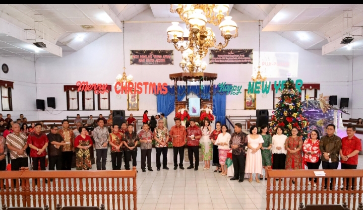 Gubernur Sulawesi Utara, Prof Dr (HC) Olly Dondokambey, didampingi Wakil Gubernur, Drs Steven Kandouw bersama istri tercinta, Ny Devi Kartika Kandouw-Tanos dan Sekprov, Ir Steve Kepel bersama jajaran Pemprov menghadiri rangkaian kegiatan Safari Natal Pemprov Sulut di Kabupaten Minahasa, Sabtu (9/12/2023) sore di Gereja GMIM Sentrum Tondano.