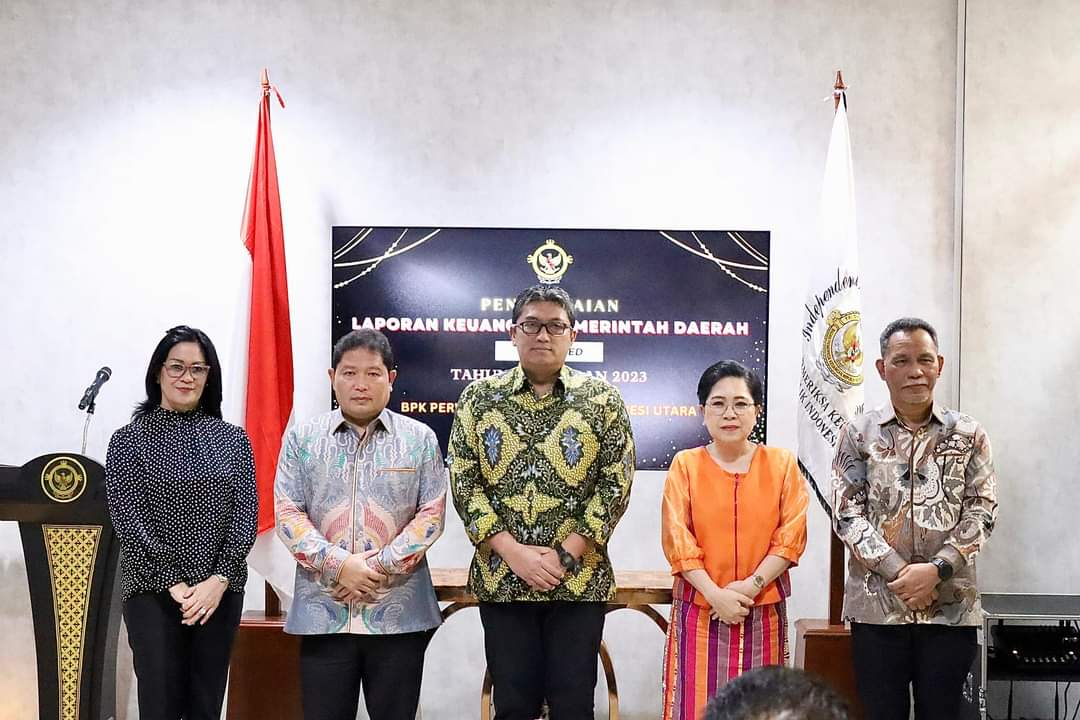 Foto: Penjabat Bupati Jemmy Kumendong saat menyerahkan LKPD tahun anggaran 2023 kepada Perwakilan BPK RI Sulawesi Utara
