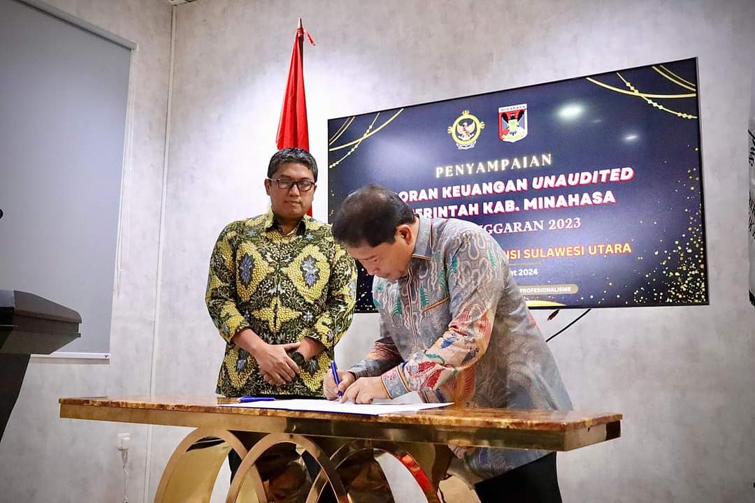 Penyerahan LKPD Minahasa 2023 unaudited ini ditandai dengan penandatanganan serah terima antara Bupati dan Kepala BPK-RI Perwakilan Sulut.