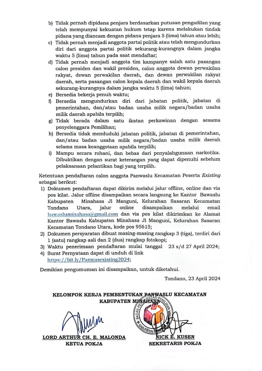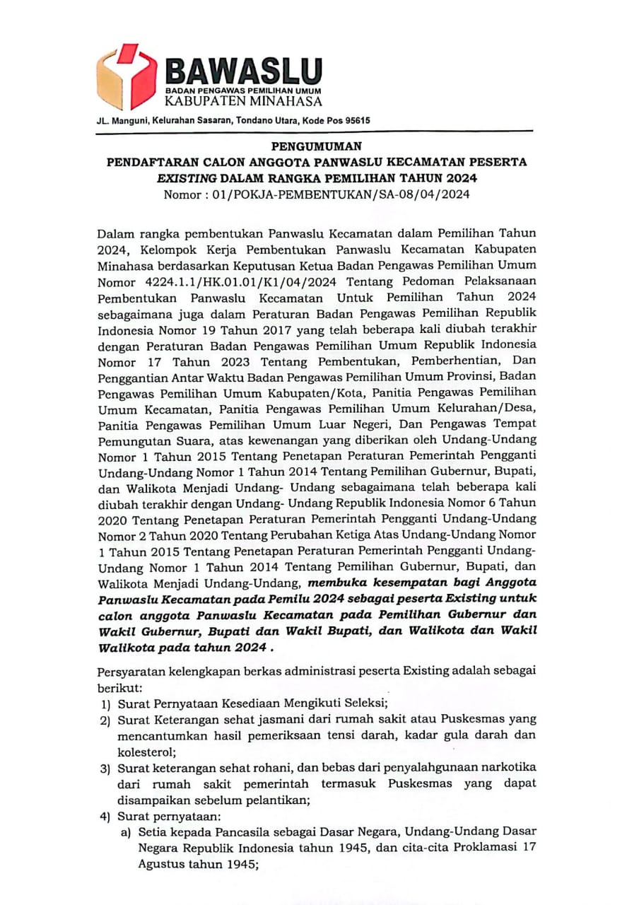 Bawaslu Minahasa Buka Pendaftaran Calon Panwascam 2024