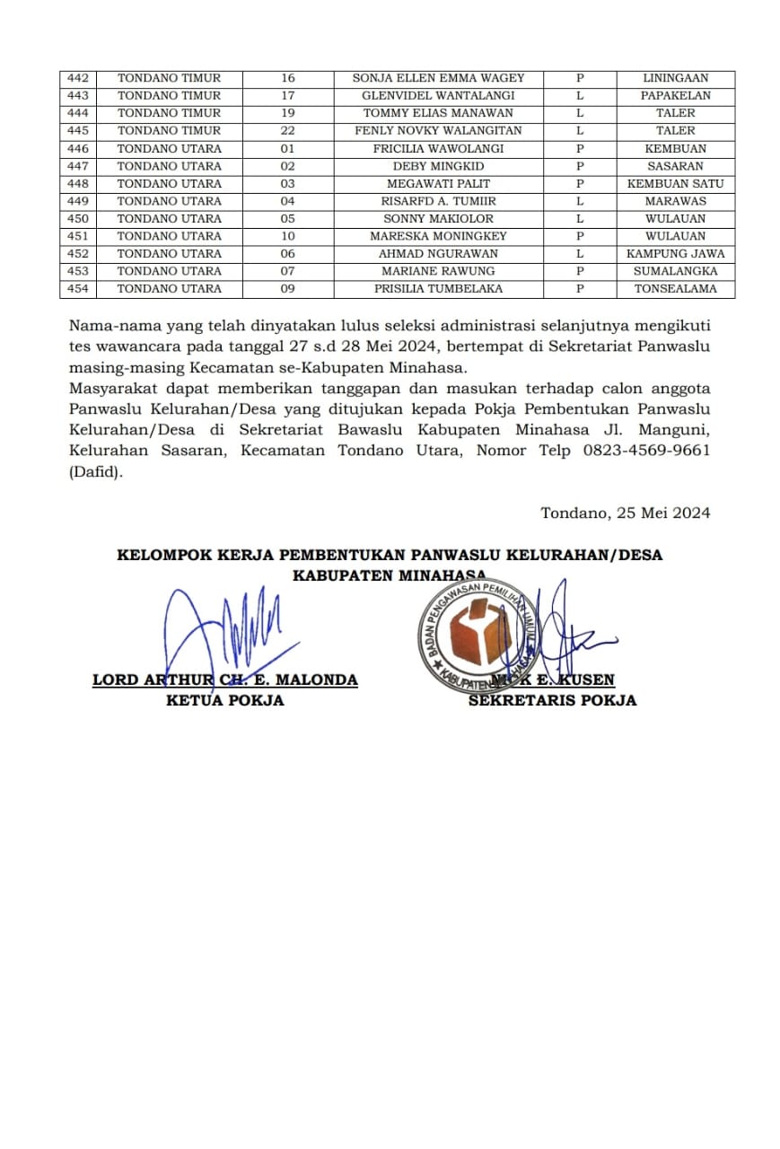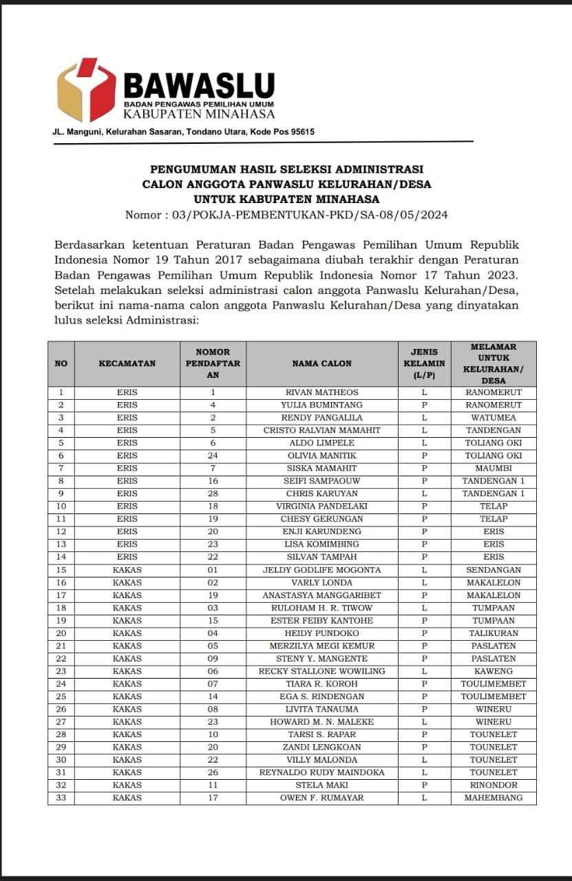 Ini Hasil Seleksi Administrasi Calon Anggota PKD Minahasa