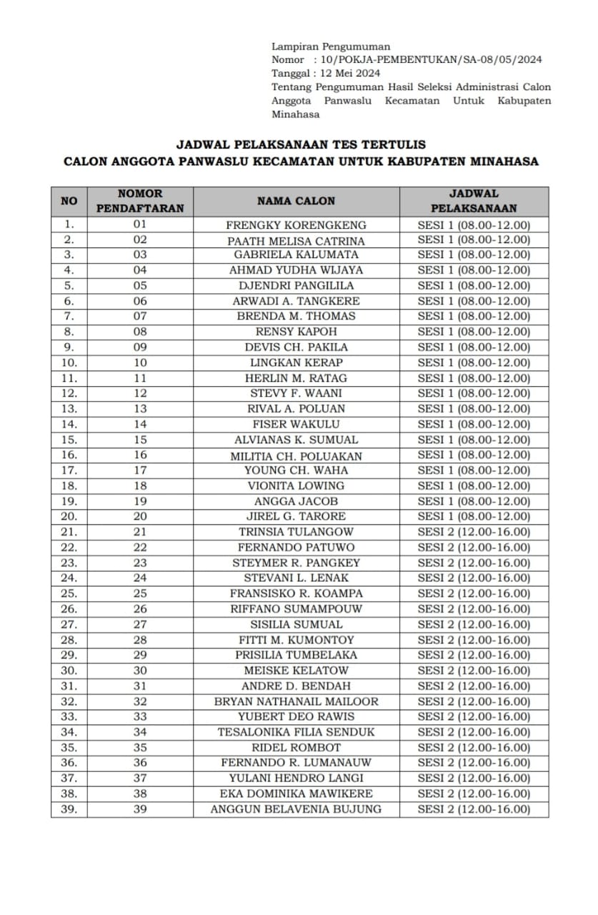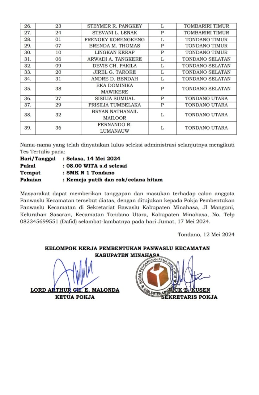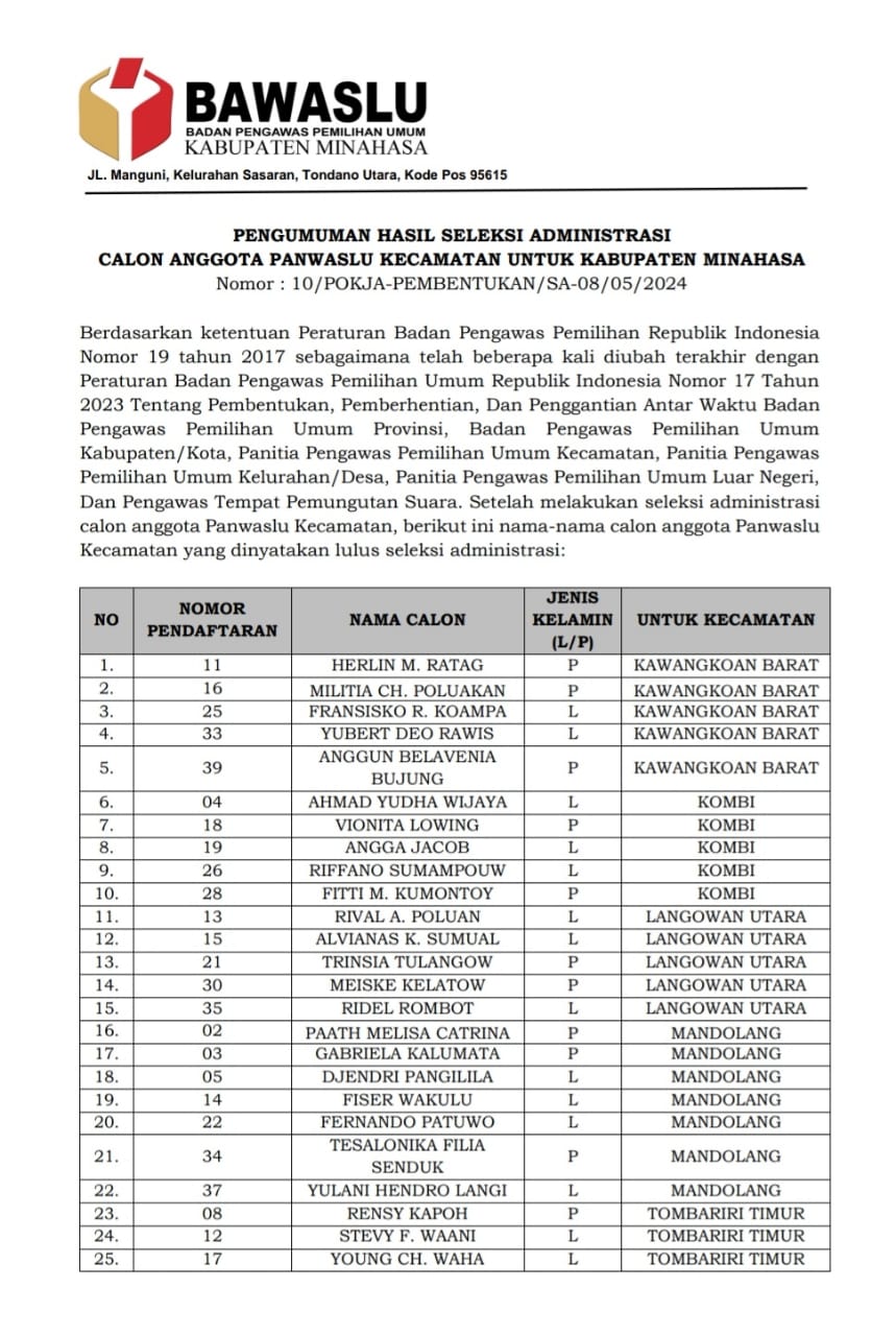 Ini Hasil Seleksi Administrasi Calon Anggota Panwascam Minahasa