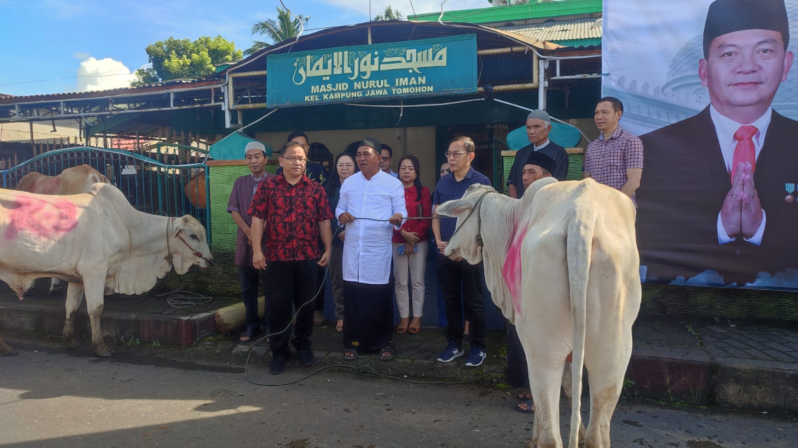 Penyerahan hewan kurban dari pemerintah kota Tomohon untuk jemaah masjid Nurul Iman Kampung Jawa diserahkan oleh asisten 1 Drs. Oktavianus Mandagi, MAP, dan diterima oleh Ketu Badan Takmir Masjid, Haryanto Tubagus.