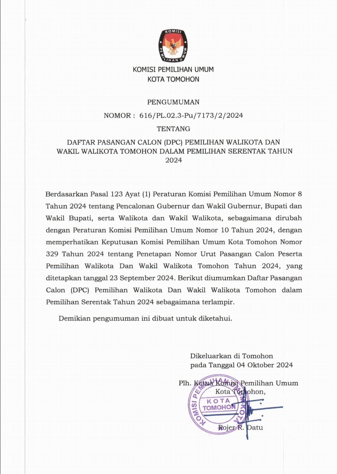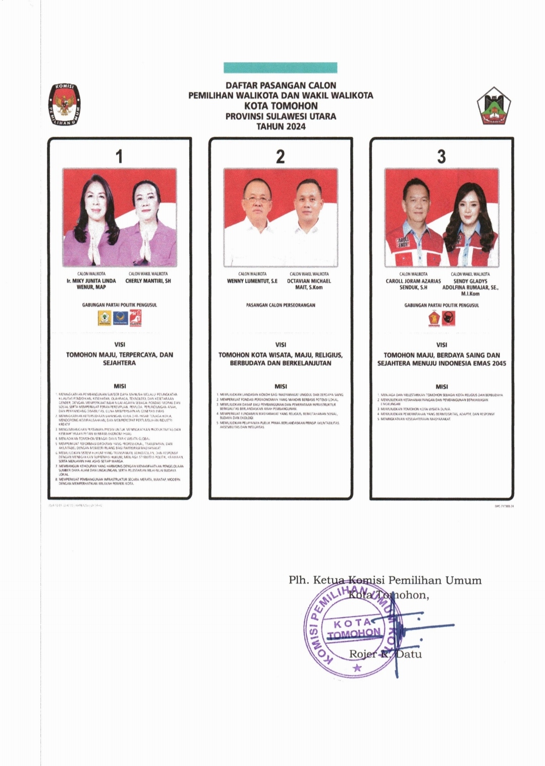 Daftar Paslon Wali dan Wawali Tomohon di Pilkada 2024