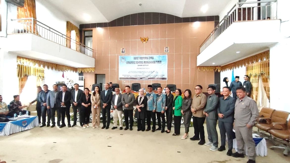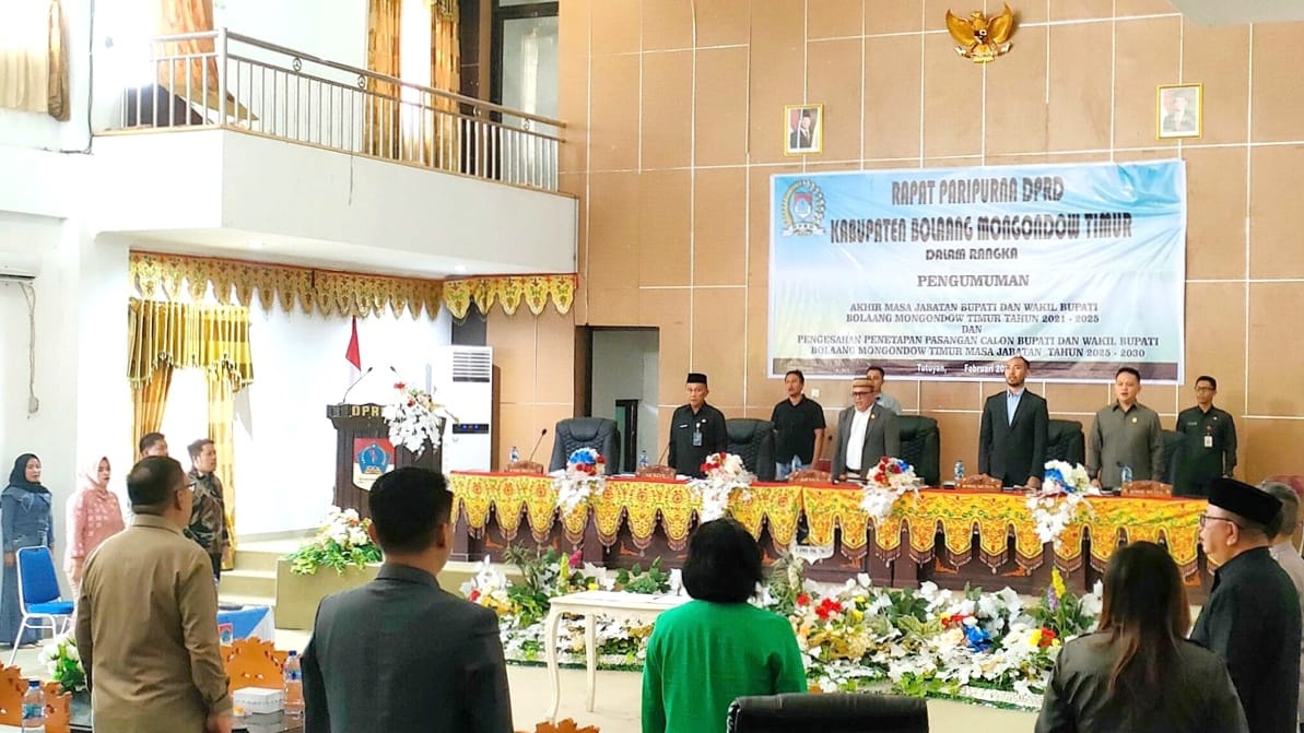 Dewan Perwakilan Rakyat Daerah (DPRD) Kabupaten Bolaang Mongondow Timur (Boltim), menggelar rapat paripurna pengumuman akhir masa jabatan Bupati dan Wakil Bupati Boltim tahun 2021-2025 dan pengesahan penetapan pasangan calon Bupati dan Wakil Bupati Boltim masa jabatan tahun 2025-2030.