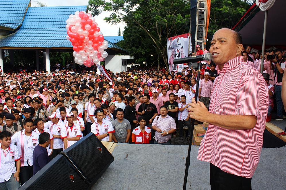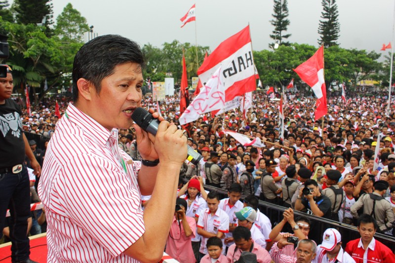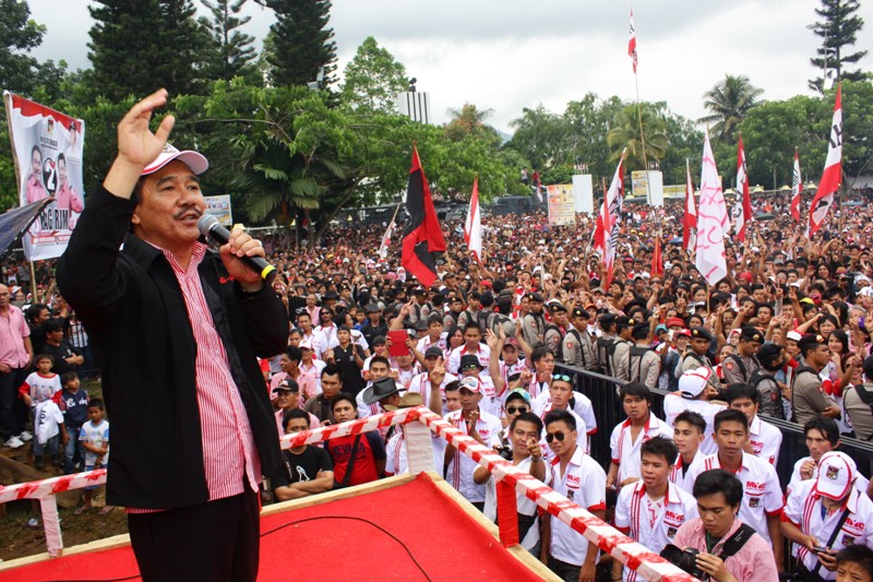 Ketua PDIP Sulut nonaktif, mantan wakil gubernur Sulut dua periode, Freddy Harry Sualang menghipnotis puluhan ribu pendukukung HAG-RJM dengan orasi politiknya.